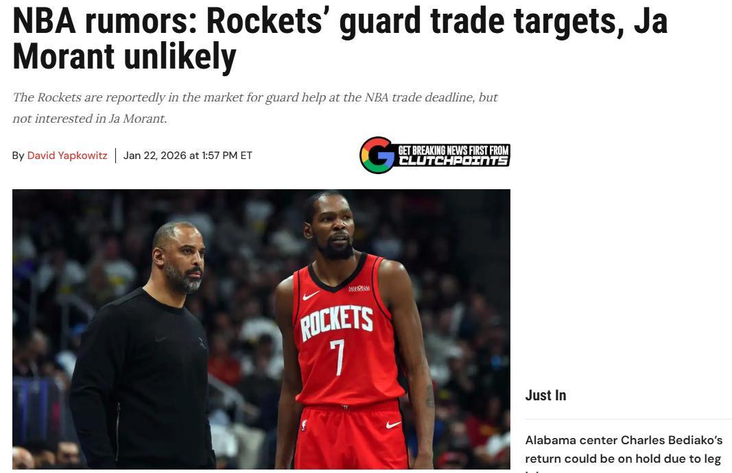 Brett Siegel在文章指出,火箭队不会在交易截止日前有大动作,因此像灰熊莫兰特、公牛科比怀特和猛龙奎克利这些交易市场中较为大牌的后卫都不会成为目标,尤其是莫兰特,火箭队对于他一点兴趣也没有。