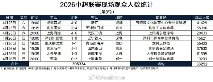 2026赛季中超联赛第8轮,8场比赛现场观众总人数高达306334人,首次突破30万人,场均达38292人,再次刷新了中超单轮现场观众人数新纪录!此前纪录为本赛季第3轮的285546人。”